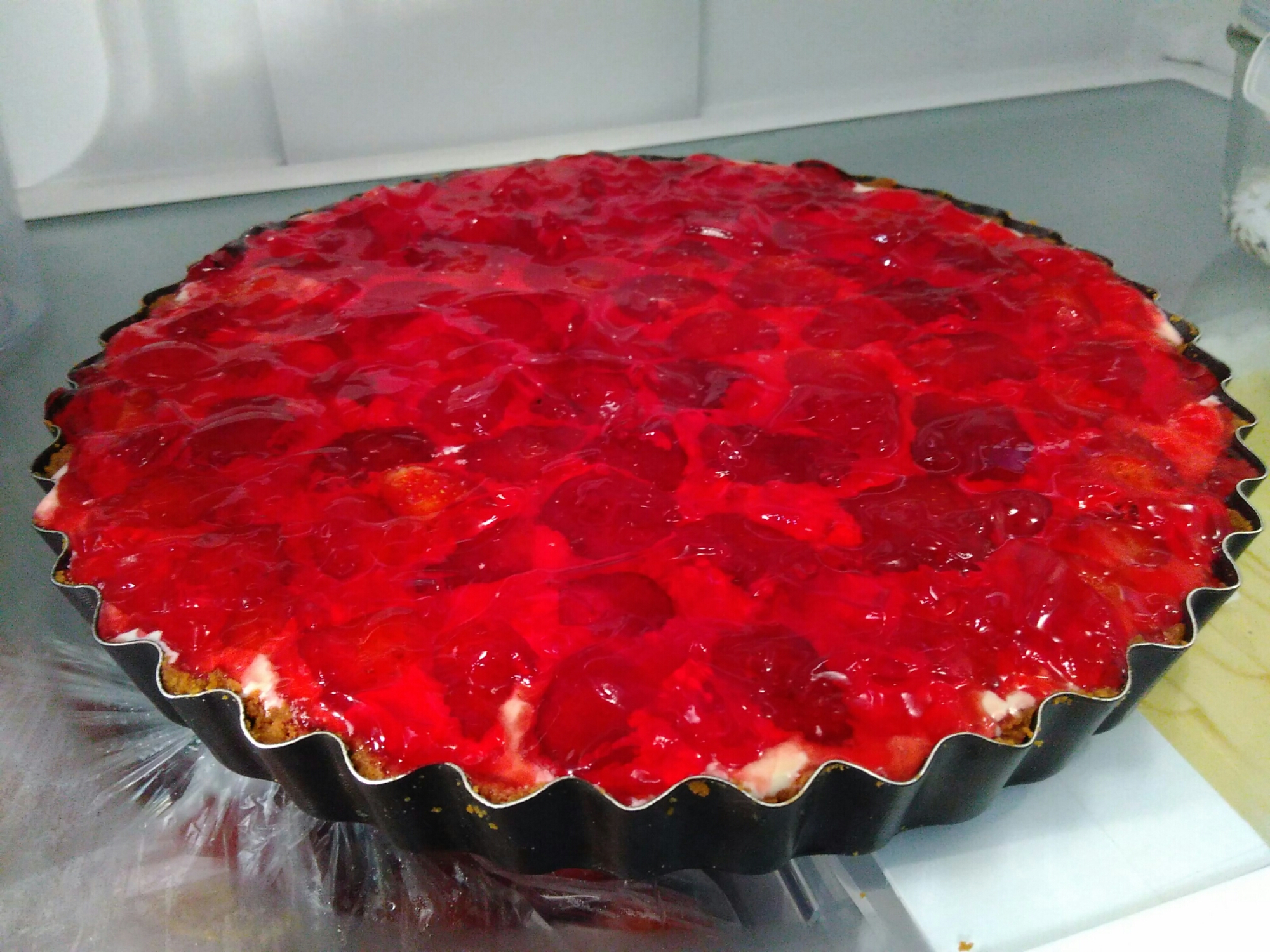 Sobre a massa pré assada, coloquei o creme de confeiteiro e a cobri com morangos cortados ao meio e sobre estes derramei uma generosa camada de gelatina de morango sem açúcar, (já dissolvida e previamente colocada na geladeira, quase a ponto de gelatinar).